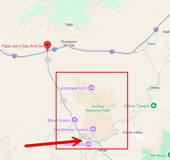 Getting to Arches is mostly straightforward. There are two ways to the park. Both ways are use Highway 191. You head south from Interstate 70 (Highway 50) at Crescent Junction. Alternatively, you can head north from Monticello through Moab. Then, cross over the Colorado River.