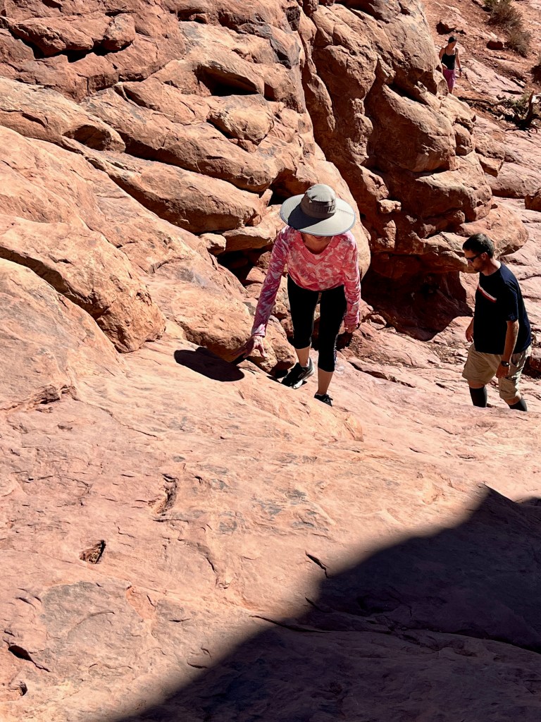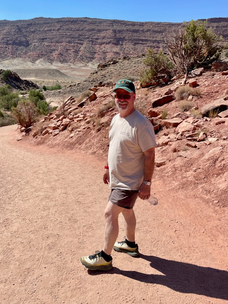Delicate Arch requires a very strenuous steep climb to view it from a distance. Alternatively, you can take a 3-4 mile hike on a primitive trail to go up to the arch. This shot of myself is on the “easy” view trail. You can see the elevation gain or at least part of it.