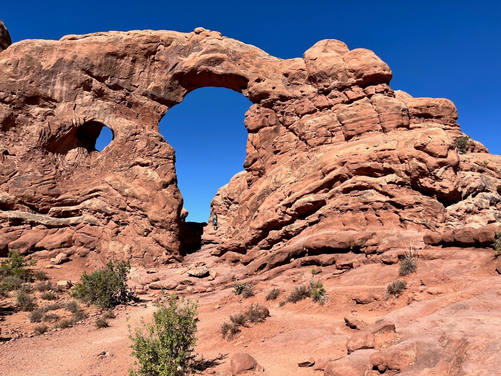 Other sights like Turret Arch require a more physical workout. Look closely on the left. You can see tiny people. This gives a sense of the scale we are talking about here.