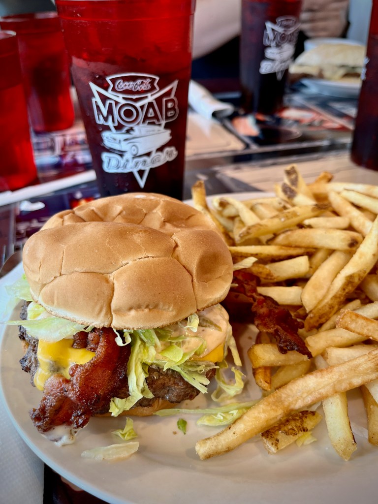 Arches National Park is an amazing place to visit but when you are done, you need to refuel and take a rest. Our newest favorite lunch/early dinner eatery is called “Moab Diner” and it is at the south end of town. Well worth the small drive to get there. Parking can be tight as it’s very popular with the locals. I’m partial to the bacon cheese burger 🙂 Its very much an classic “American” style diner and menu.