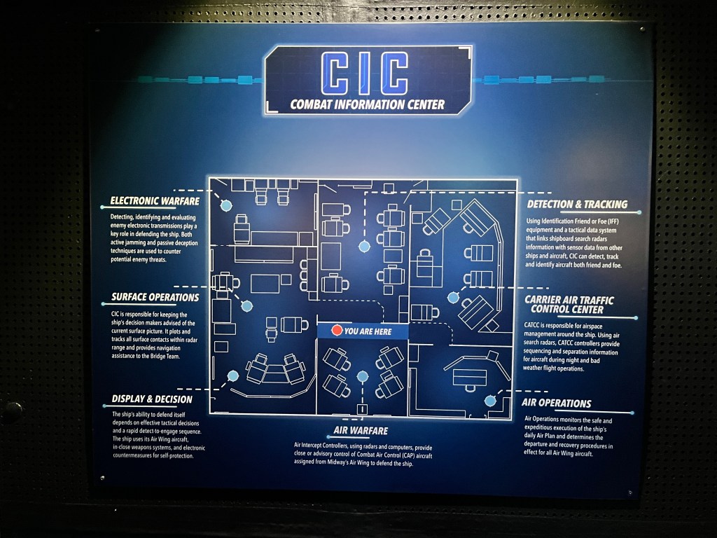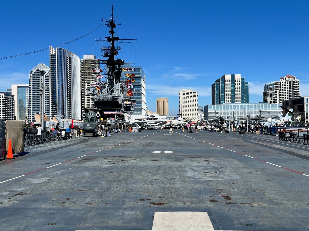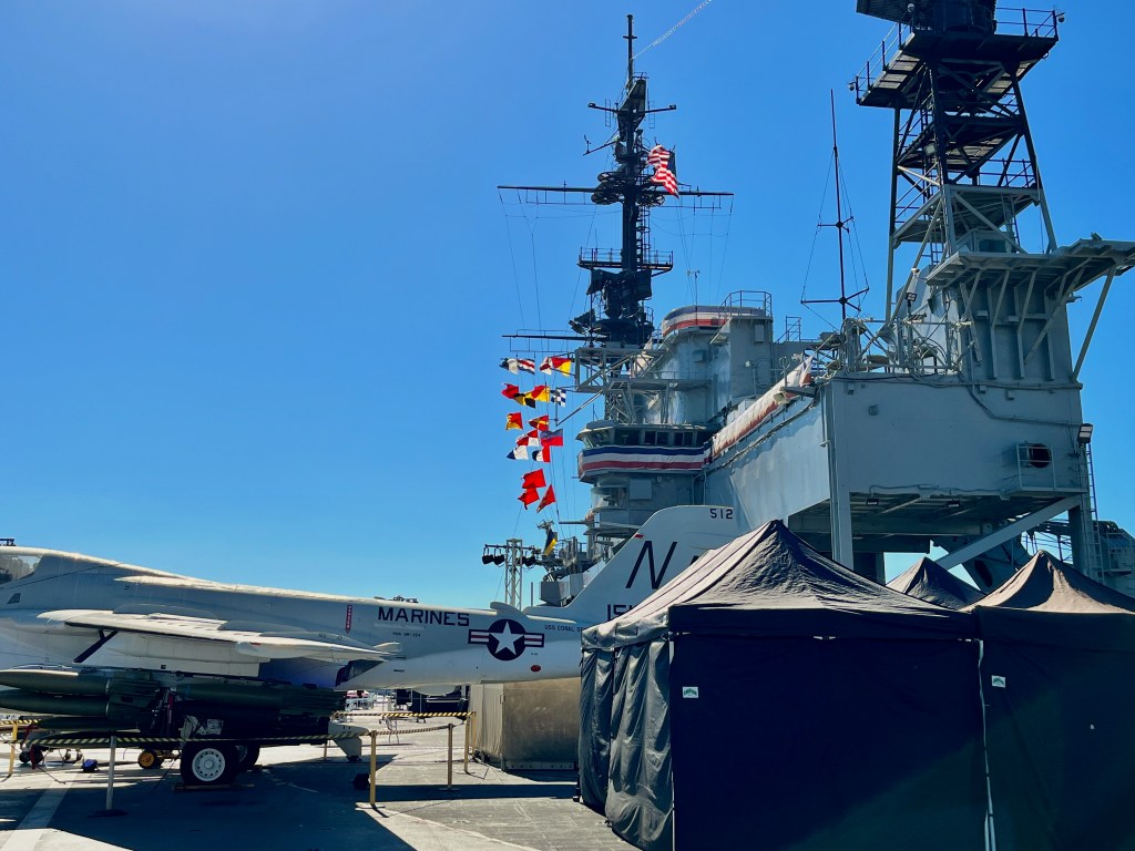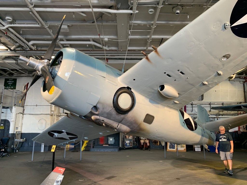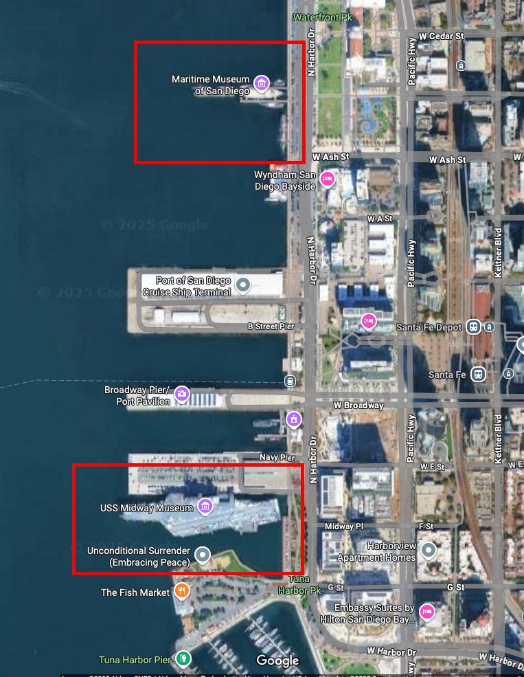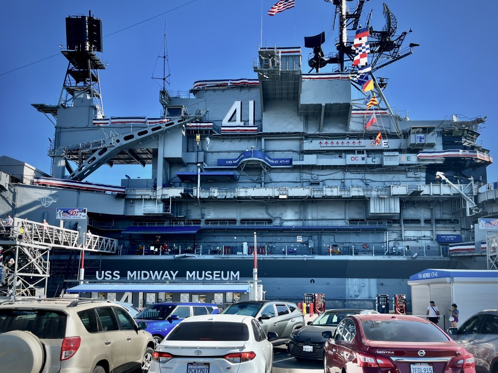 This image shows the USS Midway on the bottom (red arrow) compared to the newer USS Independence. She was built in 17 months, commissioned in 1945 and missed WWII by one week. She was decommissioned in 1992 and donated to 501(c)3 nonprofit San Diego Aircraft Carrier Museum organization in 2003. On June 7, 2004, The USS Midway opened to the public and has over 20 million visitors in the past 20 years of serving as a museum. Parking can be a challenge so get there early and wear walking shoes. It is possible to park in structures in Little Italy and walk to the ships. However, this is not ideal for strollers and very young children. There is paid parking is available next to the Midway herself and in the Tuna Harbor Park. Both fill up fast early in the day. There is SOME street parking along Harbor Drive but it also fills fast.